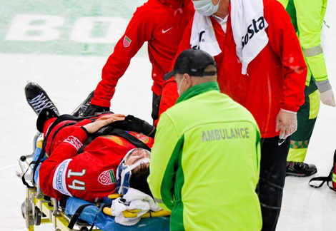 Białoruski obrońca Jewgienij Lisowec doznał paskudnej kontuzji w pojedynku ze Szwecją. Uderzył głową w bandę i przez kilka minut leżał na lodzie. Do incydentu doszło na początku 10. minuty. Lisowec próbował atakowaćCarla Klingberga, ale wpadł w bandę. Taflę opuścił na noszach. Zwożony wysłał uspokajający sygnał, pokazując kciuk do góry.