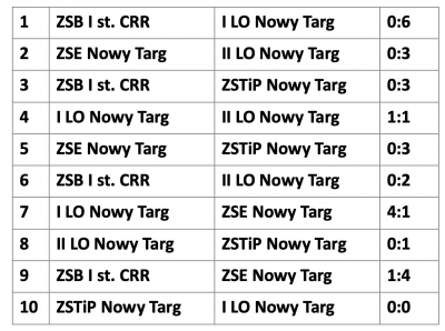 Do rywalizacji przystąpiły zespoły reprezentujące II Liceum Ogólnokształcące w Nowym Targu, I Liceum Ogólnokształcące im. Seweryna Goszczyńskiego w Nowym Targu, Zespół Szkół Ekonomocznych w Nowym Targu, Zespół Szkół Technicznych i Placówek im. Stanisława Staszica w Nowym Targu oraz Zawodową Szkołę Branżową I stopnia Cechu Rzemiosł Różnych w Nowym Targu. Rozgrywki odbywały się w systemie każdy z każdym.