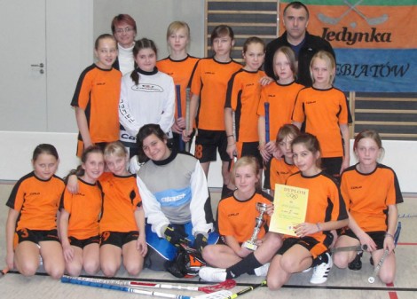 Kolejną potyczkę z Energą Olimpią Osowa Gdańsk rozpoczęliśmy tragicznie. Po 40 sekundach i dwóch błędach w obronie przegrywaliśmy 2:0. Z upływem minut nasza gra stała się mniej nerwowa, szybsza, ale brakowało skuteczności. W drugiej tercji Anna Grela zaskoczyła zasłoniętą bramkarkę rywalek strzałem z dystansu Walczyliśmy do końca, ale nic nie chciało wpaść. W końcu debiutantka Angelika Jarząbek z Eweliną Czają uszczęśliwiają nas. Pierwsza oddała piekielnie mocny strzał, który nie zdołała wyłapać golkipera i odbita od niej piłeczka znalazła się na kiju Czai. Z kolei jej dobitkę ostatnia instancja gdańszczanek nie była w stanie zatrzymać. Po remisie 2:2 z wielkim zniecierpliwieniem oczekiwaliśmy na zakończenie meczu Trzebiatowa z Gdańskiem. Wygrana Jedynki 1:0 dała nam zwycięstwo w turnieju. Serdecznie dziękujemy Urzędowi Gminy Nowy Targ oraz rodzicom za dofinansowanie wyjazdu na zawody.