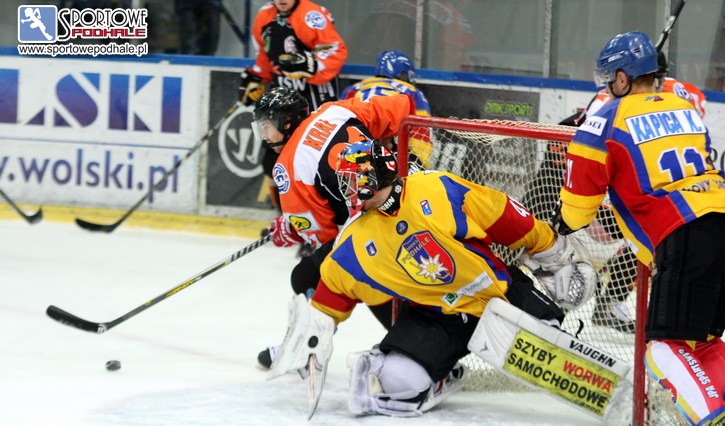 W pierwszej części gry wcielili się w wymagających profesorów, którzy już 126 sekundzie objęli prowadzenie. Niesłuchowski obronił strzał Urbanowicza, ale tak nieszczęśliwie odbił „gumę”, że ta go przelobowała. Po czwartej bramce zjechał do boksu, a jego miejsce zajął B. Kapica. Kilka jego interwencji narodzono burzą oklasków. Wygrał m.in. pojedynek oko w oko z Kralem. - Chłopcy na treningach przygotowują mnie do takich interwencji – mówi Błażej Kapica. – Nie spodziewałem się, że wejdę do bramki. Nie uważam, że był to dobry mecz w moim wykonaniu. Dla mnie bardzo ważny jest końcowy wynik drużyny. Czułem, że pomogłem zespołowi, ale trzy puszczone bramki mnie nie satysfakcjonują. Czy wierzę w wejście do ósemki? Chcemy zagrać w play off. Teraz zagramy z Krynica, Katowicami i Bytomiem, a więc z zespołami, z którymi możemy wzbogacić konto punktowe. Mamy też mecze zaległe. Trzeba wierzyć.