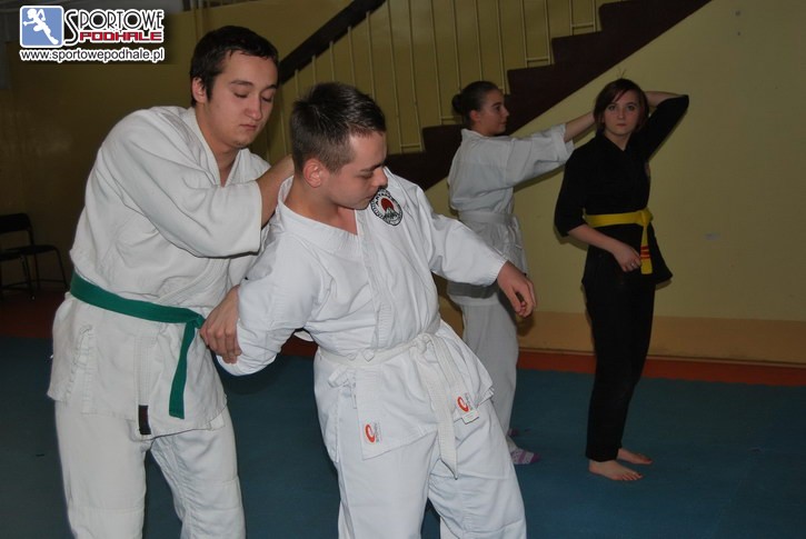 Na sali gimnastycznej w nowotarskiej hali lodowej odbył się egzamin jiu jitsu modern combat uczniów I i II klasy prywatnego liceum ogólnokształcącego dla młodzieży im. prof. Jana Venuleta, klas mundurowych o profilu wojskowo/pożarniczym i policyjnym.