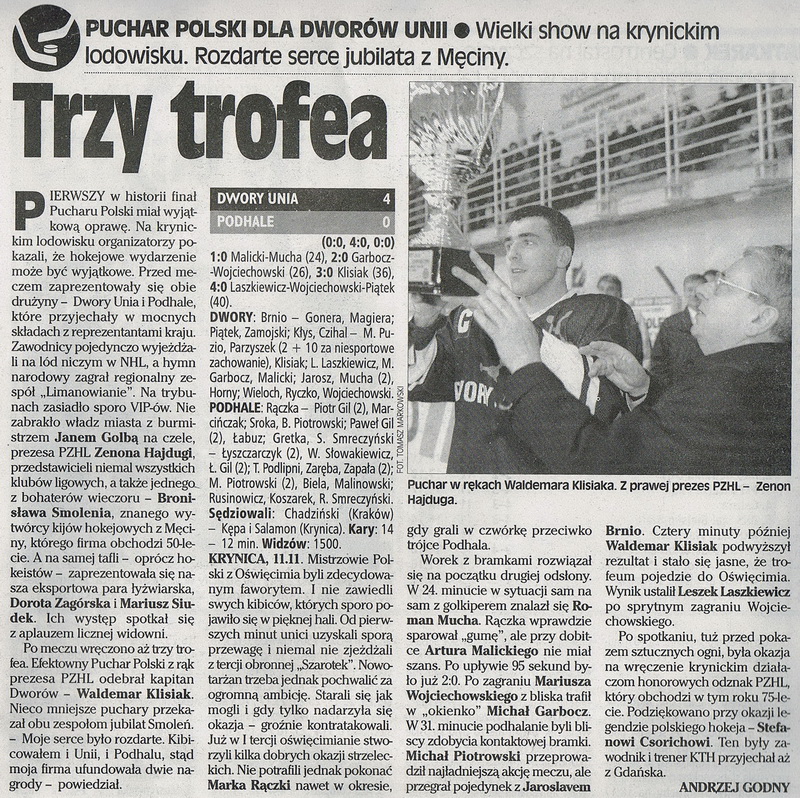 Nim wystrzeliły korki od szampanów „Władcy Podhala”, którzy zasiedli na warszawskim lodowisku przeżyli prawdziwą huśtawkę nastrojów. Mimo, iż mistrzowie Polski rozpoczęli mecz z impetem, to nowotarżanie po 28 minutach prowadzili 3:0. Ataki oświęcimian były powstrzymywane przez góralską defensywę i dobrze spisującego się w bramce M. Batkiewicza. Górale, niczym wytrawny bokser, dali się wyszumieć rywalowi, by potem przejść do niszczycielskiej roboty. W 10 minucie uderzenie Bobczka z niebieskiej linii trafiło do Radwańskiego, a ten skierował „gumę” do Łyszczarczyka, który dopełnił formalności, lokując ją w pustej bramce. Gol ten zszokował mistrzów Polski. Już nie tak zapalczywie atakowali. Do głosu doszli obrońcy pucharu i 5 minut później po raz drugi w ich obozie zapanowała euforia. Podlipni idealnie obsłużył Hajnosa i Jaworski był bezradny. Kiedy w 28 minucie Łyszczarczyk znalazł lukę między parkanami Jaworskiego, wydawało się, że jest po meczu. Byli jednak tacy, którzy przestrzegali przed hura optymizmem, przypominając ligową potyczkę z Unią w Nowym Targu. Wtedy też Podhalanie prowadzili 3:0 w połowie meczu, by ostatecznie zjechać z lodu pokonanym (3:4).