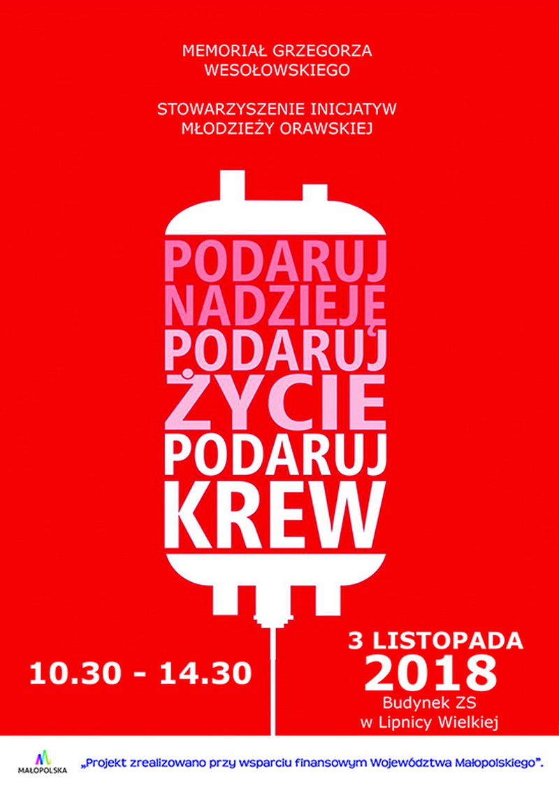 Podczas memoriału w godz. 10:30-14:30 w Lipnicy Wielkiej odbędzie się zbiórka krwi. Trzeba ukończyć 18 lat i mieć ze sobą dowód osobisty. Oddanie krwi nic nie kosztuje, a może komuś uratować życie! Serdecznie zapraszamy wszystkich miłośników piłki siatkowej do kibicowania oraz zachęcamy do oddawania krwi!