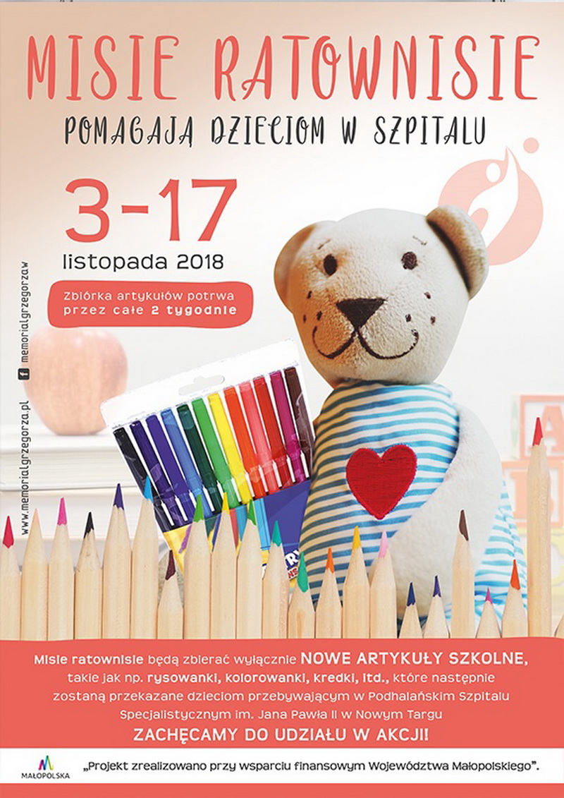 Dodatkowo w tym roku, jako kontynuacja ubiegłorocznej akcji Misie Ratownisie, zbierać będziemy nowe artykuły szkolne (kredki, malowanki, itp.) dla podopiecznych oddziału dziecięcego szpitala powiatowego w Nowym Targu. Rzeczy te można będzie zostawić w dniu turnieju na halach gdzie rozgrywany będzie turniej.