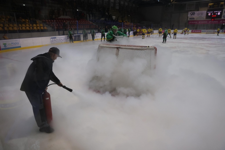 Spotkanie nie rozpoczęło się o wyznaczonej godzinie. Hokeiści obu drużyn byli po rozgrzewce i tuż przed rzuceniem krążka przez arbitra między kije zawodników, jastrzębianie znaleźli usterkę w tafli lodowej za ich bramką. Trwały dyskusje, a obsługa lodowiska z gaśnicą próbowała poprawić stan techniczny lodowej tafli. W tym czasie zawodnicy zjechali do szatni. Spiker poinformował, że mecz rozpocznie się z 20 – minutowym opóźnieniem. Usuwanie usterki trwało dłużej i grać rozpoczęto z 45- minutowym opóźnieniem.