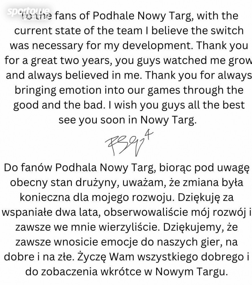 20 – letni Tomasz Szczerba, który reprezentował barwy Podhala zmienił klub. O tym informowaliśmy wczoraj w relacji z meczu Podhala z Katowicami.