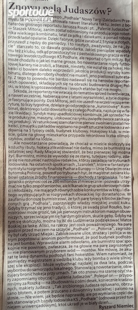 Na decyzję burmistrza o opuszczeniu obiektów przez klub zareagował felietonista Ryszard Niemiec. Odkopałem felieton „Znowu palą Judaszów?” z prywatnego archiwum. Oto jego treść: