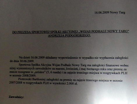 „Składamy wypowiedzenia w przypadku nie wypłacenia zaległości do 30 czerwca br. Sportowa Spółka Akcyjna ma zaległości finansowe wobec niżej wymienionych zawodników (20 na liście – przyp. SL) za marzec, kwiecień i maj br. oraz premię za mecze rozegrane w „szóstce” (5, 6 runda) i za zajęcie trzeciego miejsca w rozgrywkach PLH w sezonie 2008/09”.