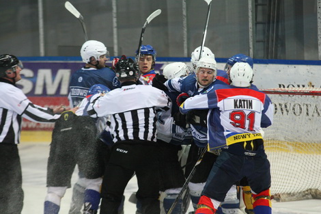 Nowotarżanie prowadzili 2:0, ale przyjezdni doprowadzili do wyrównania. Było 3:2 dla nowotarżan, lecz na drugą przerwę zespoły schodziły przy remisie 3:3. Początek trzeciej odsłony to dwa mocne wejścia Kondraszowa i Stypuły. W 50 minucie gospodarze przyspali grając w przewadze i Ziółkowski zdobył kontaktowego gola. 34 sekundy przed końcem przybysze znad morza wycofali bramkarza, ale manewr nie przyniósł im powodzenia.