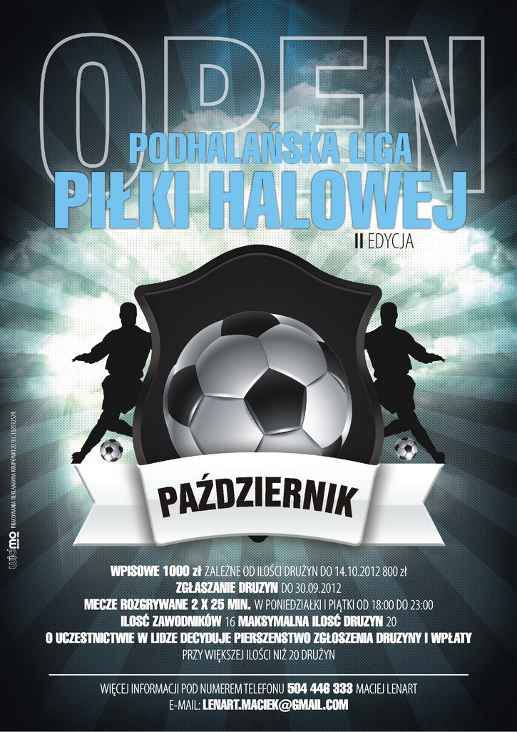 Serdecznie Zapraszamy wszystkie zainteresowane drużyny na II Edycje Podhalańskiej Ligii Piłki Halowej Open na Hali Sportowej w Cichem. Mecze rozgrywane będą 2x25 minut.
