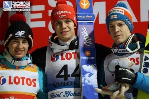 AKTUALIZACJA ZDJĘĆ: Niemiec Andreas Wellinger wygrał konkurs Pucharu Świata na skoczni im. Adama Małysza w Wiśle. Drugie miejsce zajął Kamil Stoch, który wskoczył na podium z piątego miejsca po pierwszej serii i zwiększył przewagę w klasyfikacji łącznej PŚ. Na najniższym stopniu podium stanął Austriak Michael Hayboeck. Pierwszy po pierwszej serii Jan Ziobro zakończył zawody na szóstym miejscu.