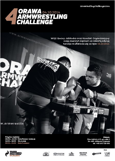 Zapraszamy serdecznie na 4 odsłonę ORAWA ARMWRESTLING CHALLENGE. 04.10.2014r zawodnicy zmierzą się w 21 kategoriach dla juniorów, amatorów, kobiet, mastersów (osoby po 40 roku życia) i zawodowców.
