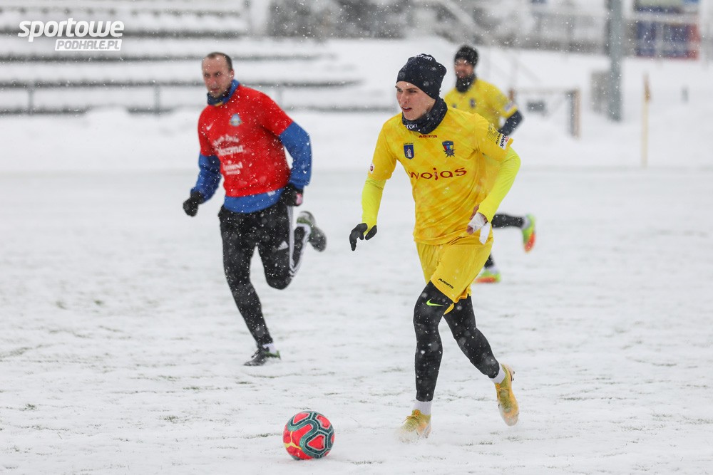Siódmy mecz kontrolny nowotarżan przed rundą wiosenną rozgrywany był w trudnych warunkach podczas gęsto padającego śniegu, na mocno zaśnieżonym boisku.